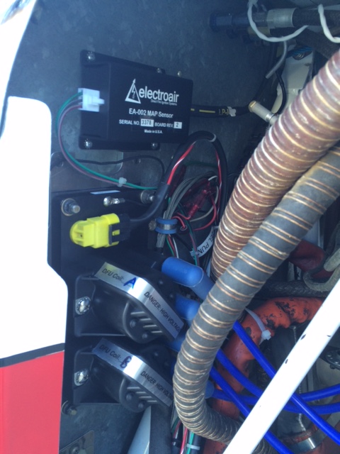 The system has a Mag Timing module that replaces the right mag. I put the Coil Pack and the MAP sensor on the firewall and the EIS Controller is mounted inside under the pax right knee. The Gen1 EIS didn’t have the requirement to mount the Controller inside so I had it on the firewall, as well. I thought I was going to have a difficult time finding space inside the cockpit to fit the EIS Controller. But it’s as if the Controller was sized to fit on the Main Beam between the upper and lower Spar Caps. Hidden and well protected. And No, I didn’t drill through the main beam – I epoxied on some ClickBond #10 studs and attached the EIS Controller to that.