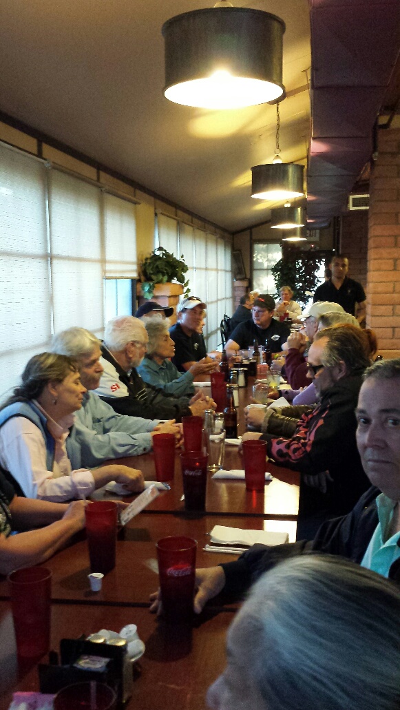 Saturday started out with beautiful weather again and now we had 9 T-18' on the ramp and six AC headed out for the Winslow Meteor Crater . We made several laps around the crater before heading back to home base . Hopefully someone got some pics they can post . I think Lou might have some GoPro video ? By the time the crater flight was done it was time to head to town for a lunch at the Golden Goose café to honor Ken Knowles . Ken was a significant part in making the T-18 AC a reality for a lot of folks by supplying ready made parts and kits for a lot of us , including me ! We had a great turn out for Ken . I think I counted 24 at the lunch . After lunch it was back to the airport for a quick break and then for those of us that signed up for the Jeep tour it was 2 hours of bone crushing excitement as we traveled one of the back country roads . The rock formations were amazing and the Jeep driver/guide was both funny and informative . If you are on the waiting list for a new kidney I DO NOT recommend one of the Jeep tours ! Good chance you will need a double kidney transplant when it is over ! We got back to the Lodge just in time for a quick bathroom break and some clean clothes (without the Red Rock trail dust) and then it was a short walk to the Airport Mesa Grill for dinner . Good thing we had a reservation as it was packed . Dinner was very good and the end to a perfect day !