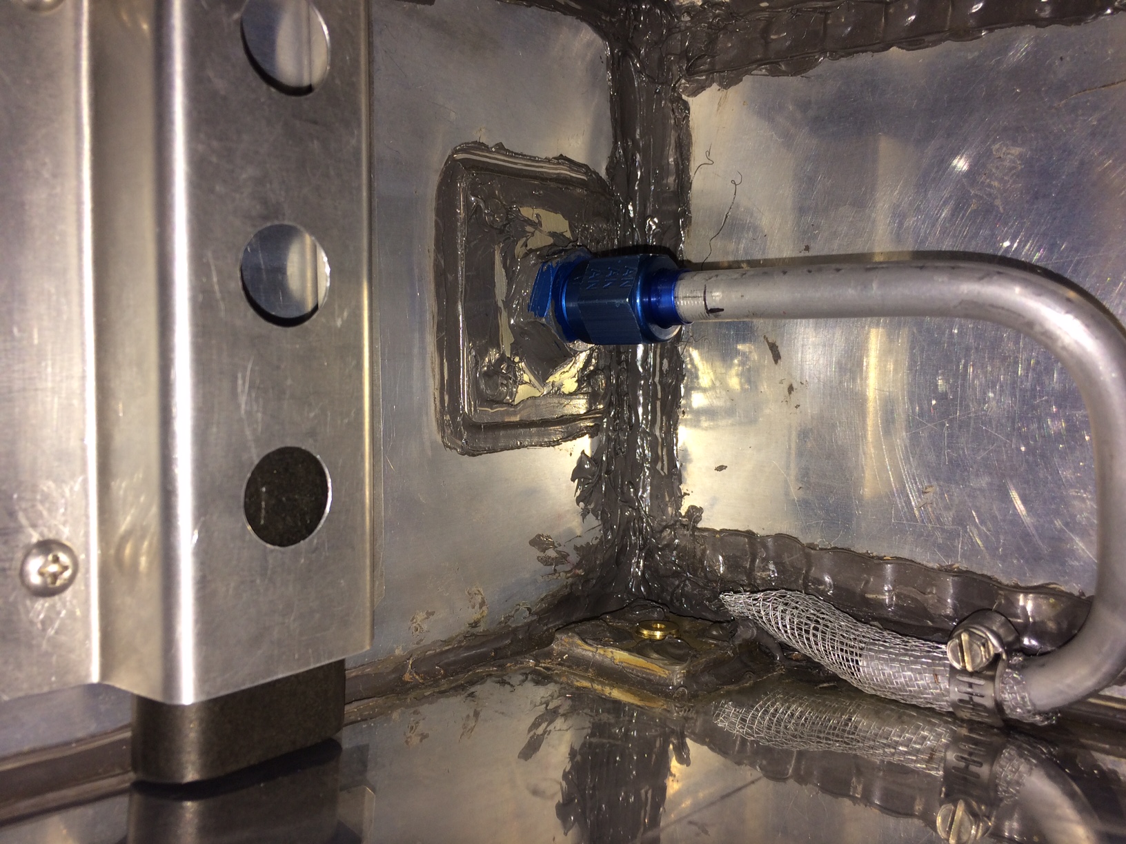 Besides, I like pictures and figure others may too. The Facet pump is in forward tunnel, pushing through a tube going up center of the firewall to top of main tank. Floor panel is removable, also with access cover at center. Float can be seen in other photo, and pickup tube with screen.