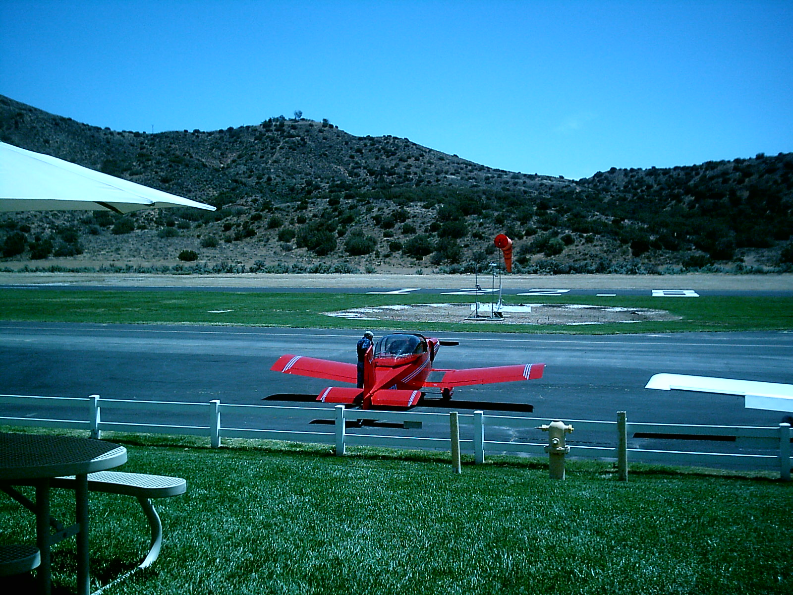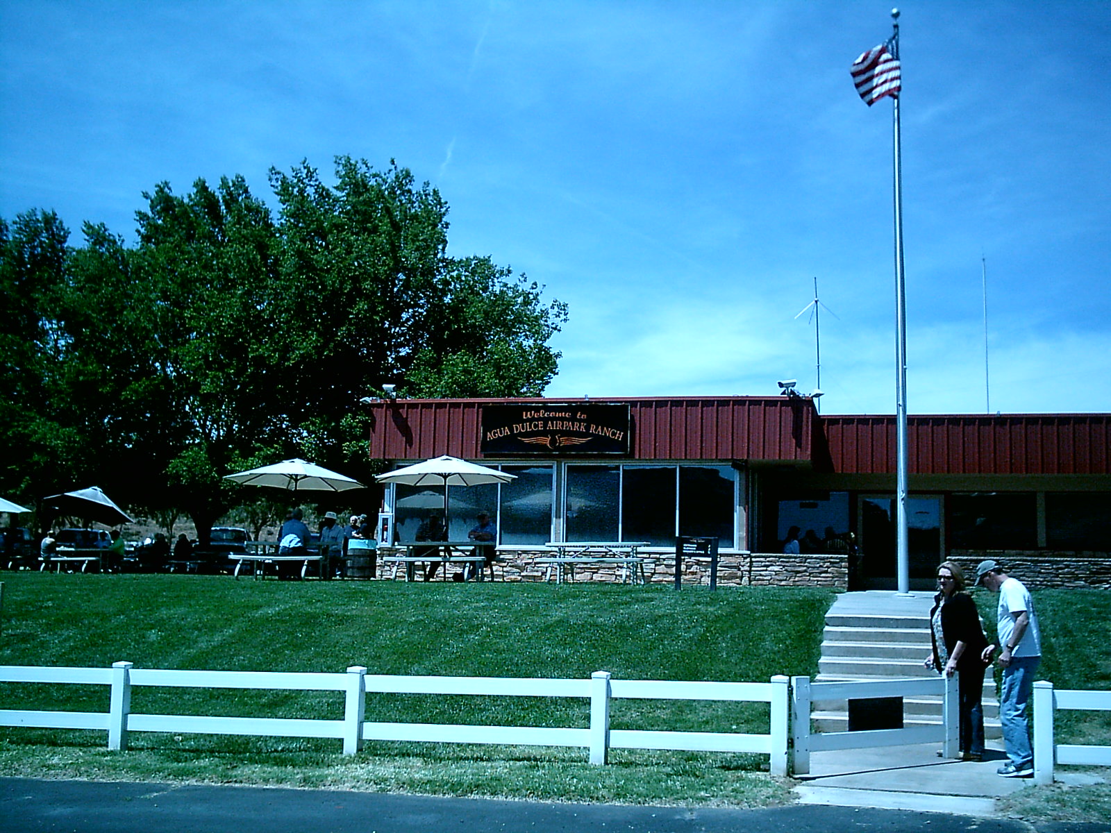 John Kerr flew with me in my AC up to Agua Dulce Airport (L70) today for their once a month $5 BBQ . You can go to the airport web site and see the monthly BBQ schedule . A very nice airport tucked in the hills along the Antelope Valley Freeway (I-14) . A beautiful little FBO with nice shade trees and plenty of tables and umbrellas . Fuel is located right next to the picnic area . You would be hard pressed to find a better BBQ anywhere...1/2 pound burgers or turkey burgers or your choice of a full pound hot dog . Dress them up with chili or with all the traditional fixins . Included is a drink of your choice , bag of chips , potato salad , slaw , fresh fruit salad .