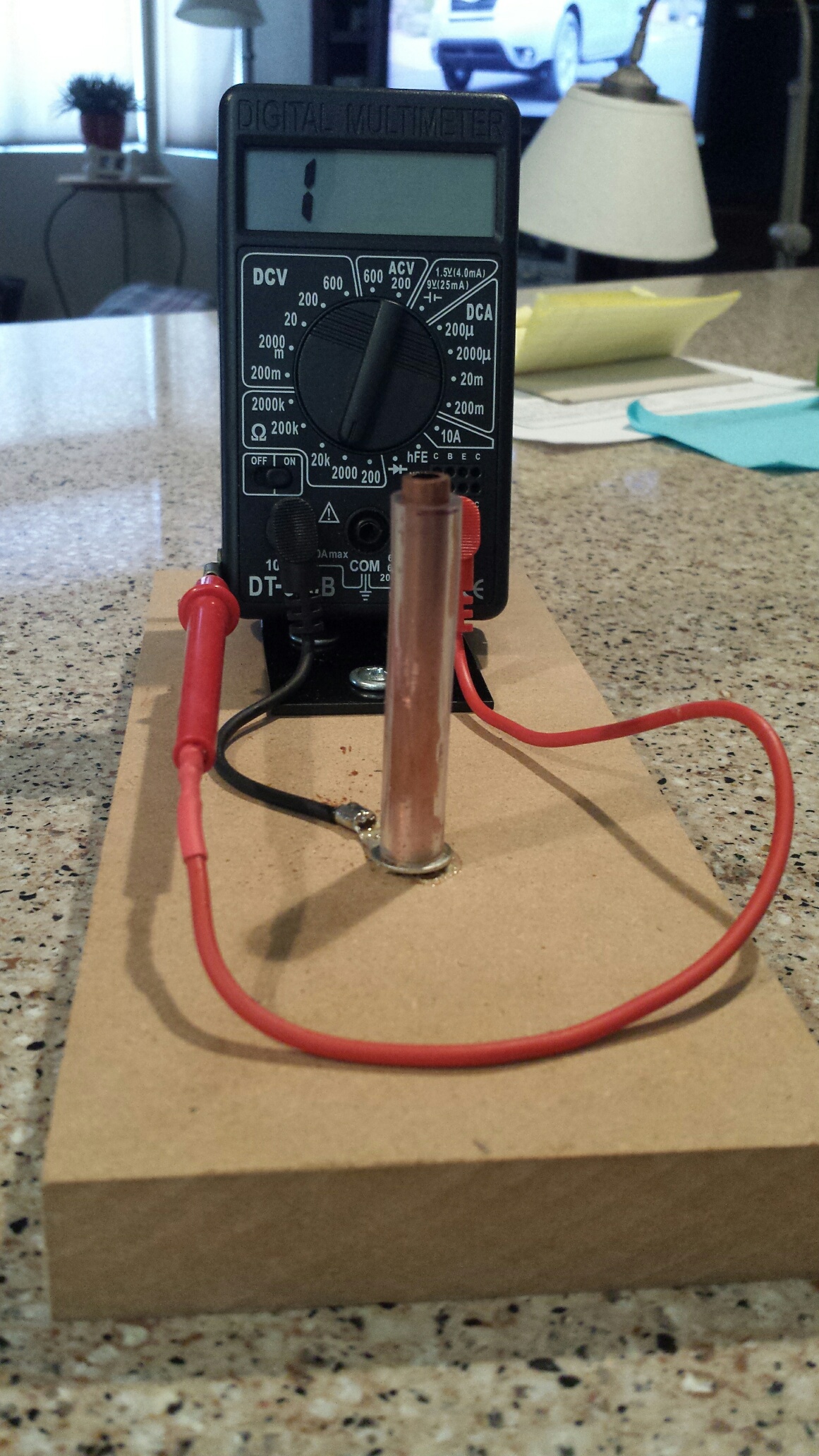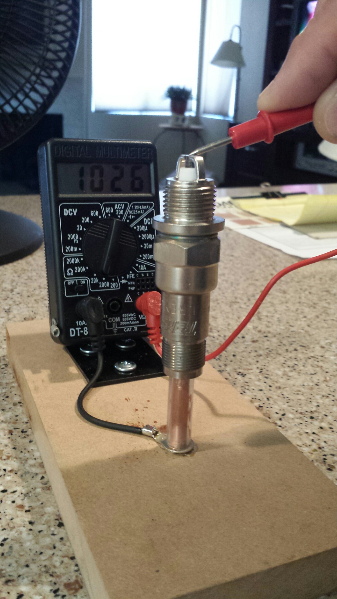 Mount the metal support to the MDF anyway you care to . Attach the Ohm meter to the mount with the Velcro . Insert the copper tube into the end of the plug and then cut it about 3/4" longer . Take the ring terminal and slip it over the copper tube , leaving about 1/2" at the bottom of the copper tube . Solder the ring terminal to the copper tube . Drill a 1/4" hole in the MDF and glue the copper tube into the hole . Take one of the Ohm leads (I took the black one) and cut it to length to reach the ring terminal and solder the wire in place . Fit the rubber or vinyl tubing over the copper tube , leaving about 1/4" copper tube at the top . Place the spark plug onto the "tester" and then shorten the other Ohm lead so as to comfortably reach the center electrode of the plug . Turn on the Ohm meter . If you followed the directions correctly you should have a read out on the Ohm meter . If not throw the whole thing away and start over !