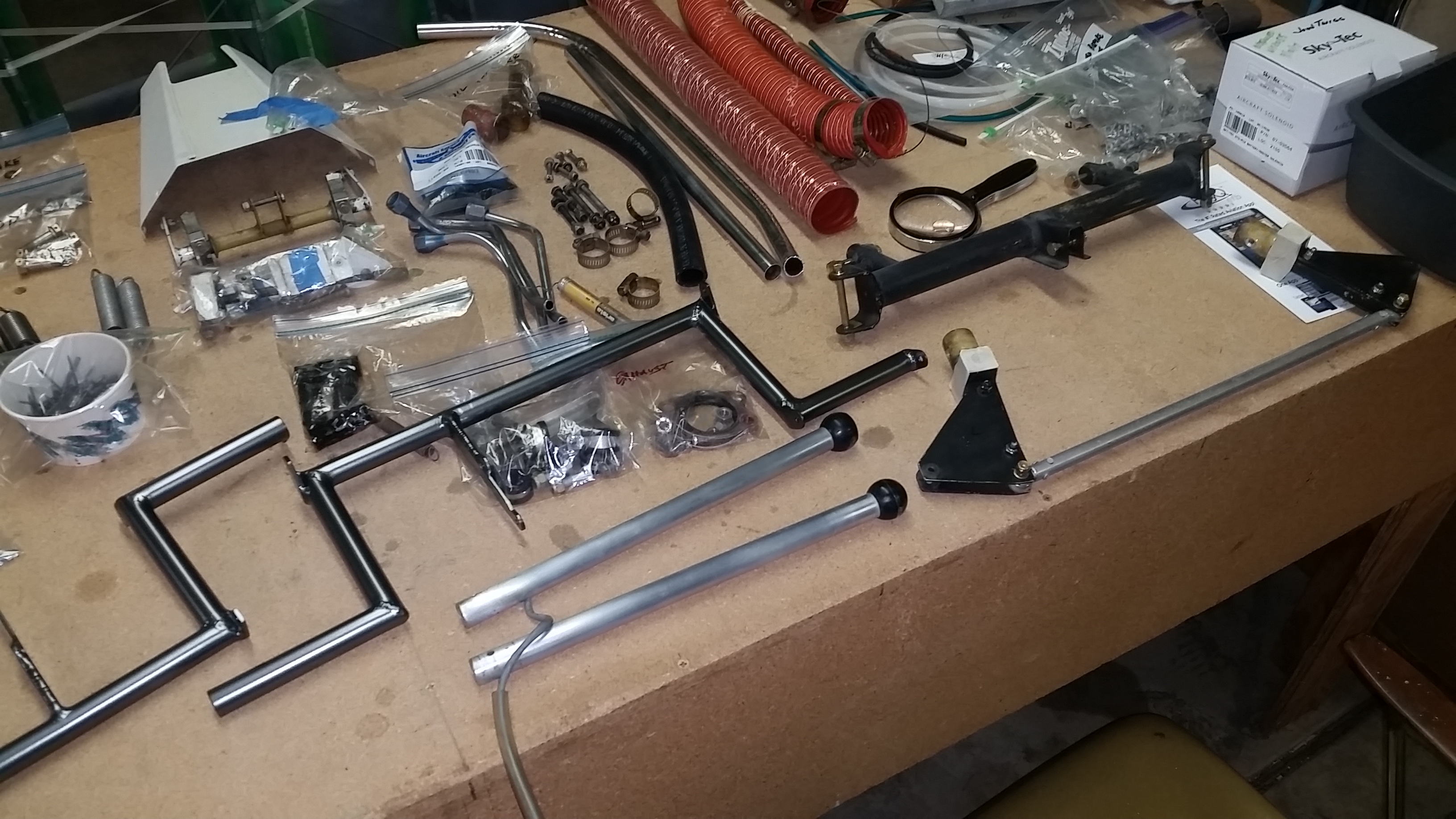 File comment: Control system parts in various stages of restoration. Look at those rudder pedals painted with GM "gunbarrel metallic" paint!