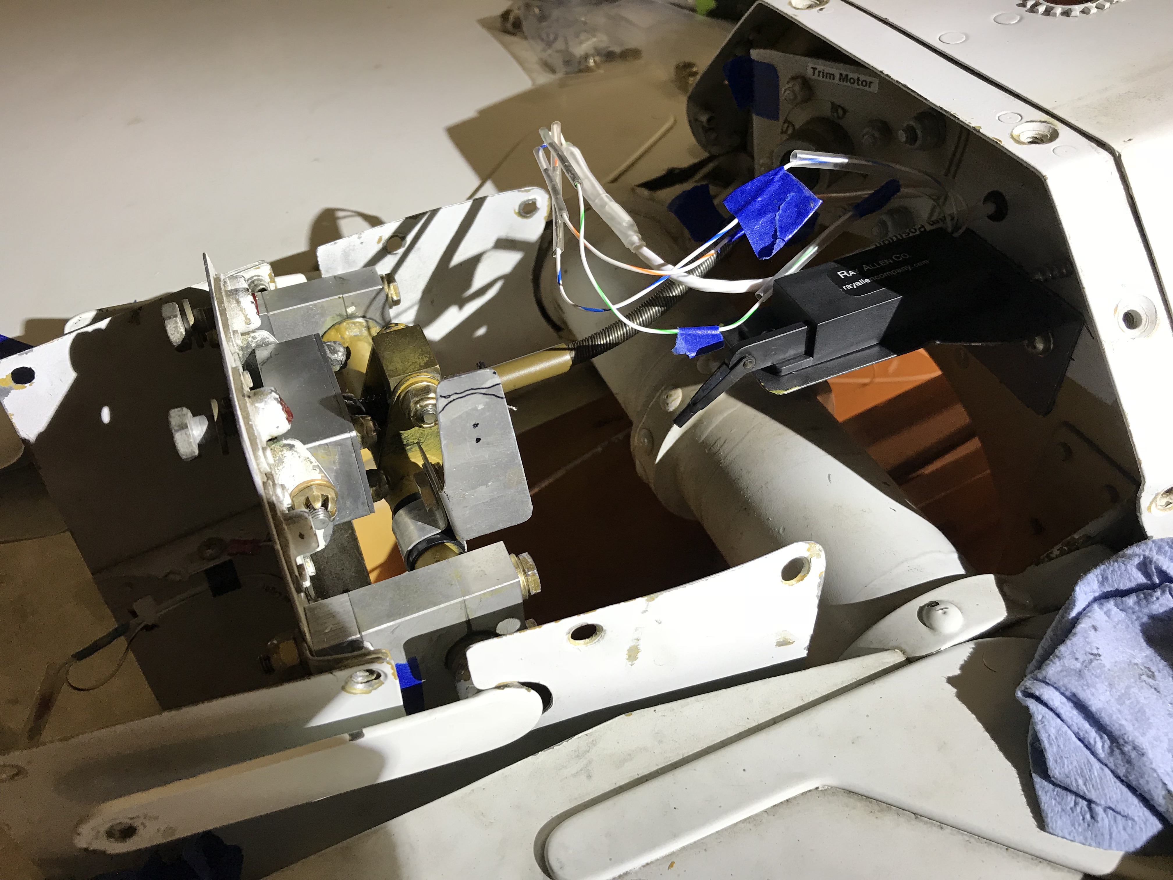 Here's a picture of where I added a Ray Allen trim position sensor in the tail and mounted a corresponding arm to the trim axle. There is about 1" clearance between the sensor and the top of the horizontal stabilator spar. The rod between the sensor and the arm (with the two black ink dots) is yet to be installed.