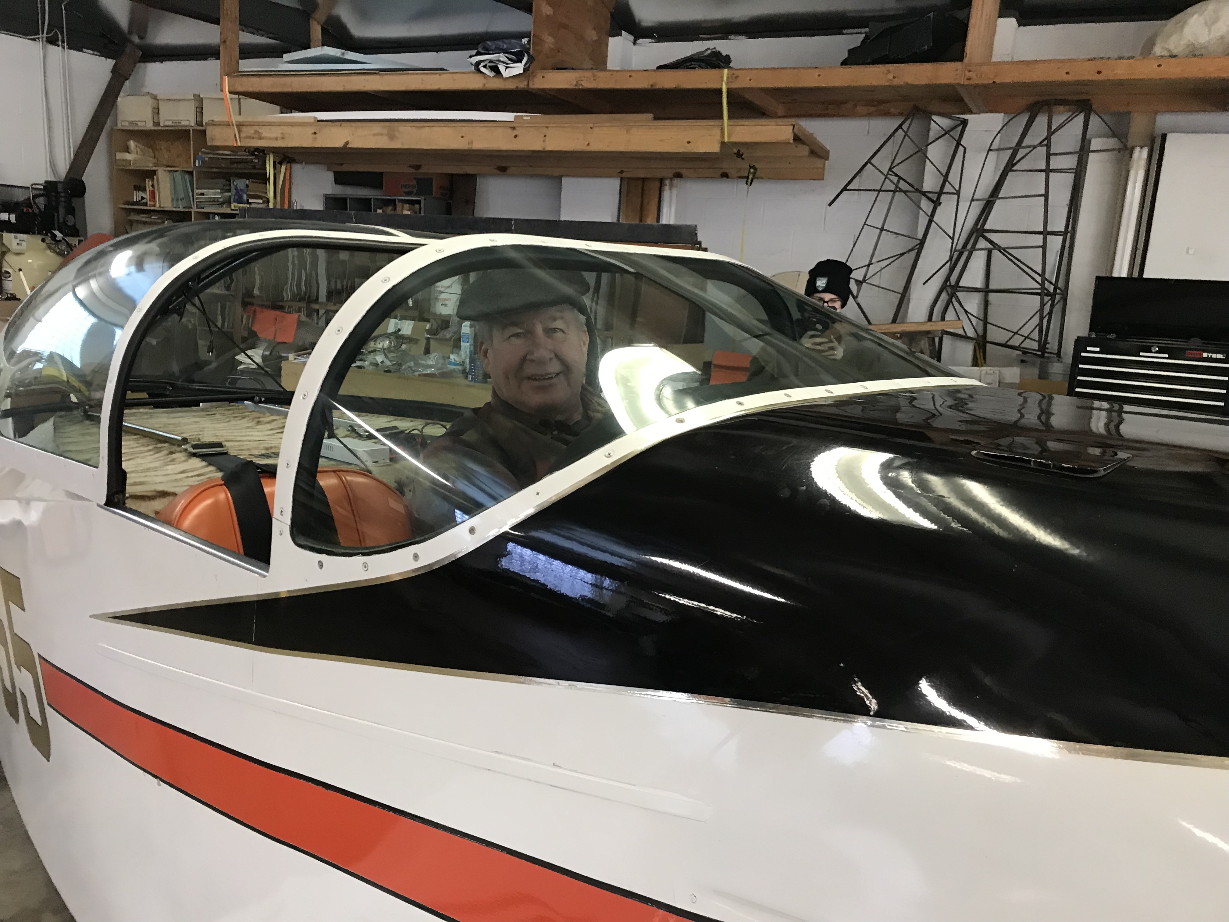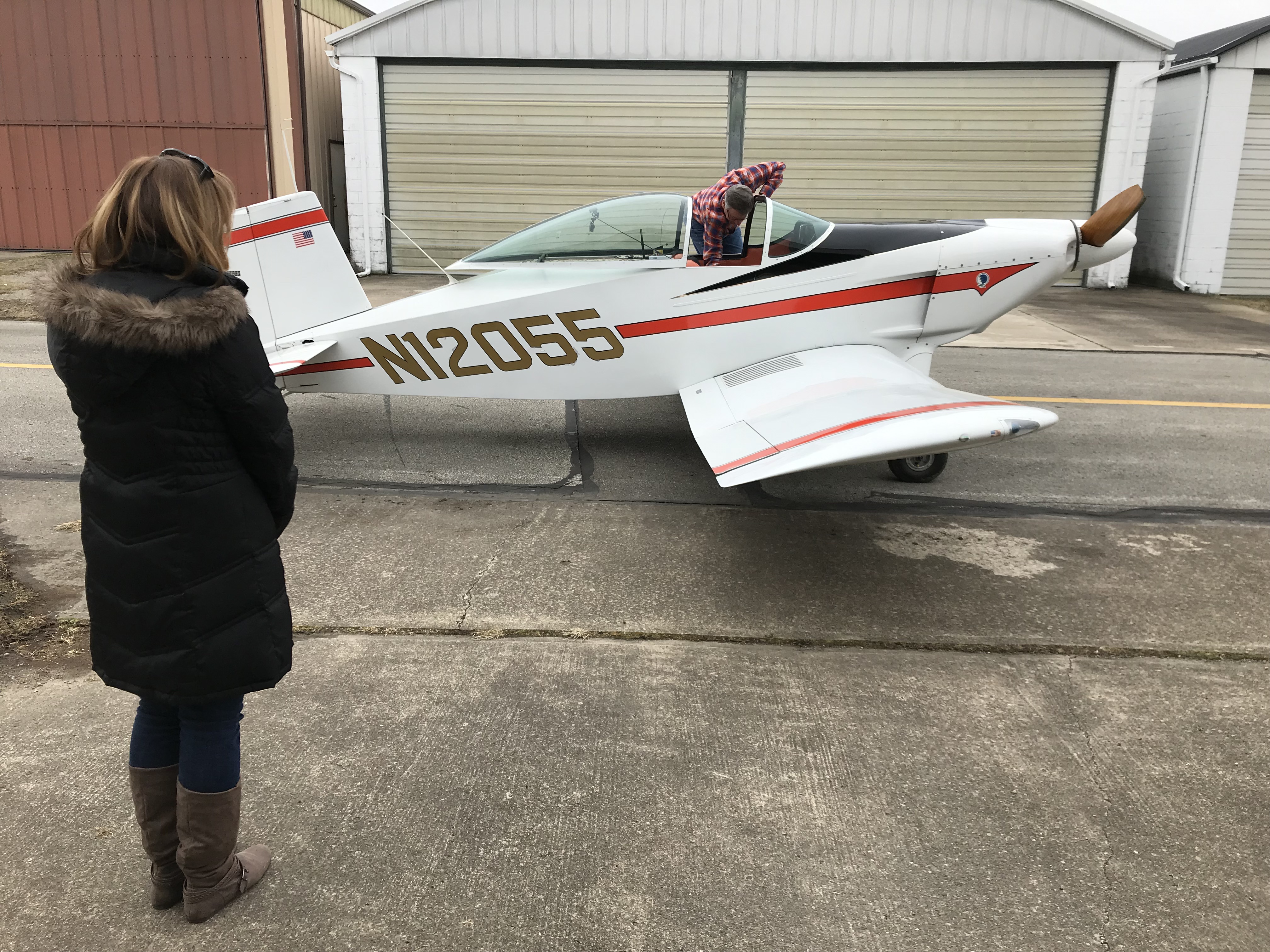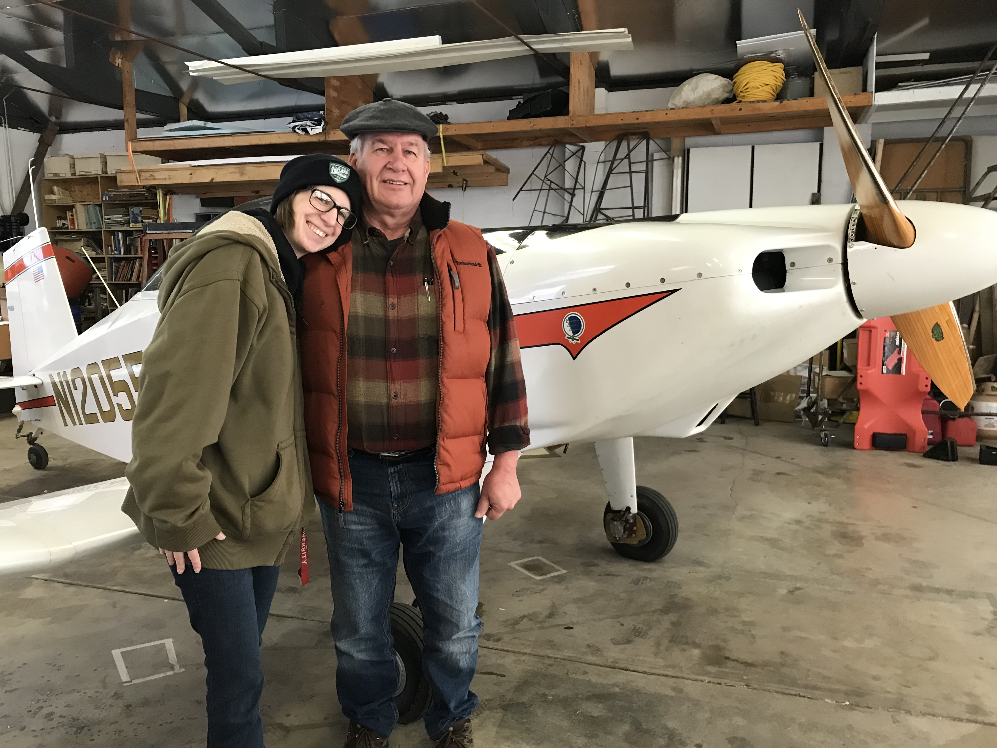 Well, we've come full circle with this thread's final post and it's about Doug Burke's visit two weeks ago. Doug started me on this journey by selling me his beloved airplane that he wanted to find a good home for. He and his father, Ed, bought N12055 in 1979 at Oshkosh as rjaeger and others probably remember. I didn't know anything about a Thorp T-18 at the time I bought it and Doug told me so many good things about the design and his airplane in particular. So, here are a couple of pictures from Doug and his daughter's visit on Friday, Feb 15th. Doug just retired from American Airlines in December after four decades as an airline pilot.
