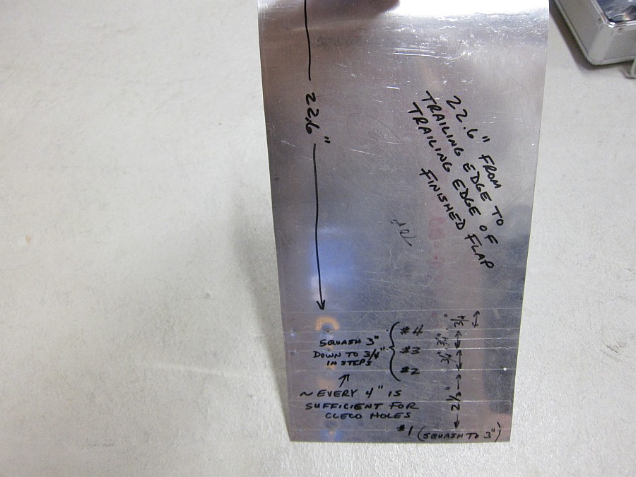 The flap skins were one of the more difficult pieces to form for me. I wasted a lot of material. There is a lot of info in the old newsletters and some good ideas about how to do it. There was also discussion about using .020" instead of .025" material, as this would be easier to form. I don't know if John Thorp ever confirmed that this would be OK or not, at least in writing. I know that there was discussion about how he supposedly chose .025" in order to utilize existing material & not have to purchase .020" just for this one assembly, & that .020" would be fine. I can't confirm that. Anyway, to your question... this is what I ended up doing. Like Bob said, extra material which is then trimmed away is very helpful. The pictures are of my test strip which I used to develop a sequence which produced an acceptable shape for me. The thing is old & beat-up now, but I hope you can read the markings on it. I made a hole transfer strip to lay out the series of identical holes to hold the skin in "folded" position with clecos. I started with the more gradual upper portion of the curve first (#1 set of holes) & pushed the skin down with a large board (just like we do to form the wing skins), but used a 3" thick "spacer" (2 - 2x4s) in between to automatically limit the amount of bending. I then proceeded to using the other lines of holes in sequence, but this time decreasing my "spacer" thickness in steps down to 3/4" for all the rest. It came out as you see in the last picture. I hope this is halfway clear to you. I'm not saying this is the best or easiest way to do it, but it's what I did.