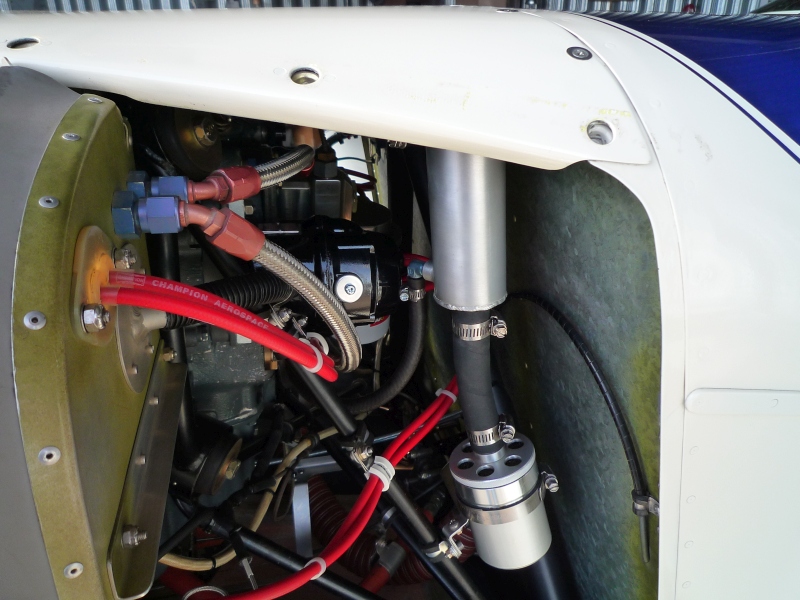 Total time, airframe & engine (160 hp Lyc. O-320-D2A) – 1307 hrs. The engine is still very strong & uses approximately 1 qt. of Aeroshell 15w50 between 25 hr. oil changes. I have never had to add oil between changes. Custom engine-mounted spin-on oil filter adapter. Custom air/oil separator system. Cochran S.S. cross-over exhaust system. Very clean engine compartment with Thorp-style baffling & silicone rubber seals. Custom Oxygen sensor air/fuel mixture detector circuit. Aymar-Demuth 68-75 prop.