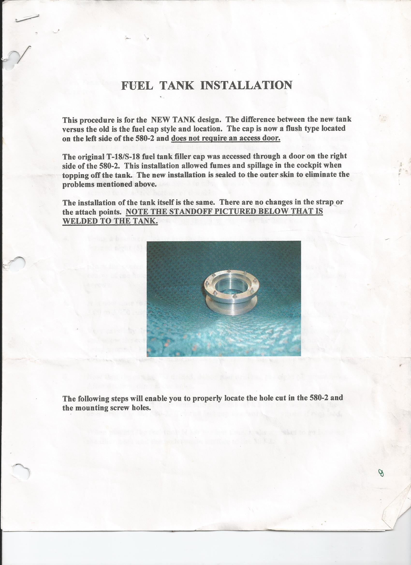 My fuel tank came from Classic Sport Aircraft (CSA) and attached is a copy of part of the installation instructions and a pic of the "extension and flange" that is welded to the top of the tank . It was a VERY tight fit and the hole location for the CS attachment screws came from the modified machine screws ( ground down to a point) . The tank was placed in the cradle and the "screws" left a small dimple for hole location . A gasket was placed between the flange and the bottom of the skin . I am very happy with this set up . No fumes and a final visual check on the cap prior to take off . ;)