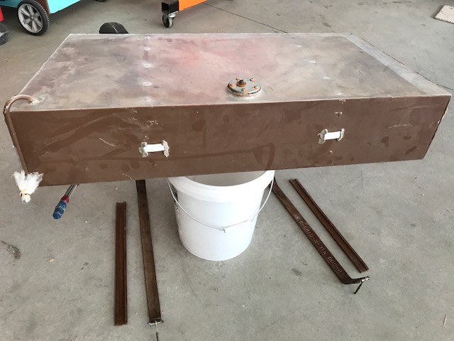 It's a custom made rectangular black rubberized fabric bag that was built to conform to the space. It has a special foam inside that holds the shape and prevents sloshing. It's filled by filling either of the wing tanks. There may be wing isolation valves also, so it's probably vented. It has a cover plate. It's over 20 years old and still looks new, nice & pliable.