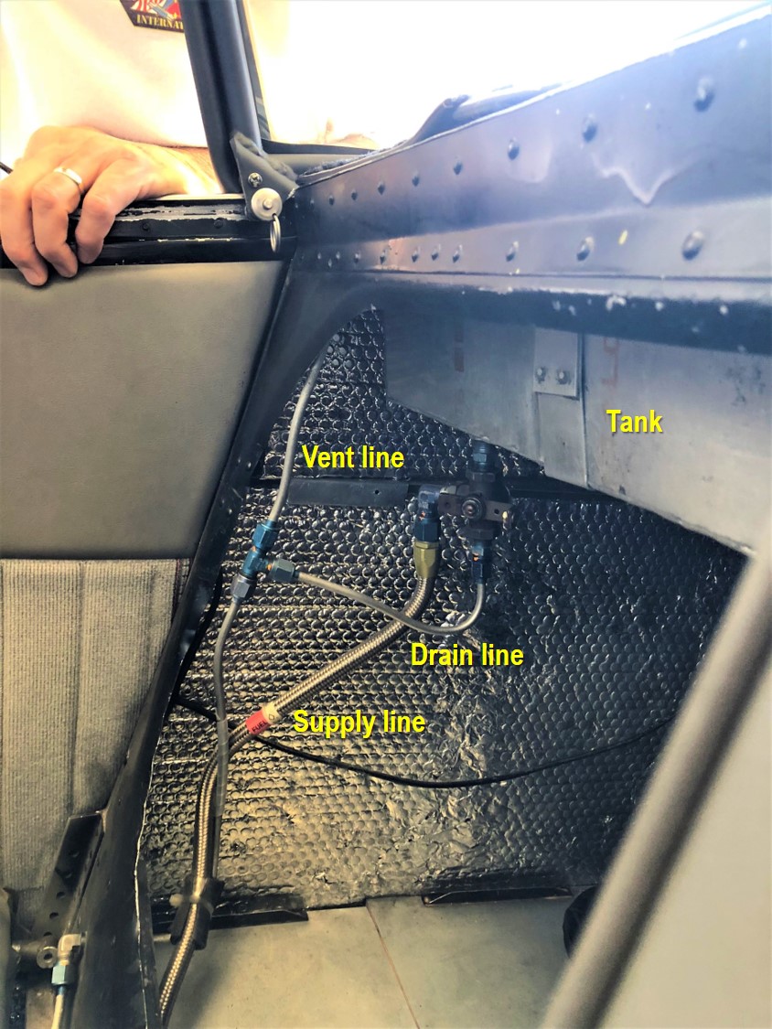 My fix would be to move the outlet to the rear and install a gascolator on the floor to trap any contamination. That takes care of 2 problems: 1) sump checks and 2) gives a low point in the system that the hoses can drain to. Essentially, I would duplicate what I have seen on Cessna and Piper aircraft and follow the "rules" for fuel system design published by people like Tony Bingelis.