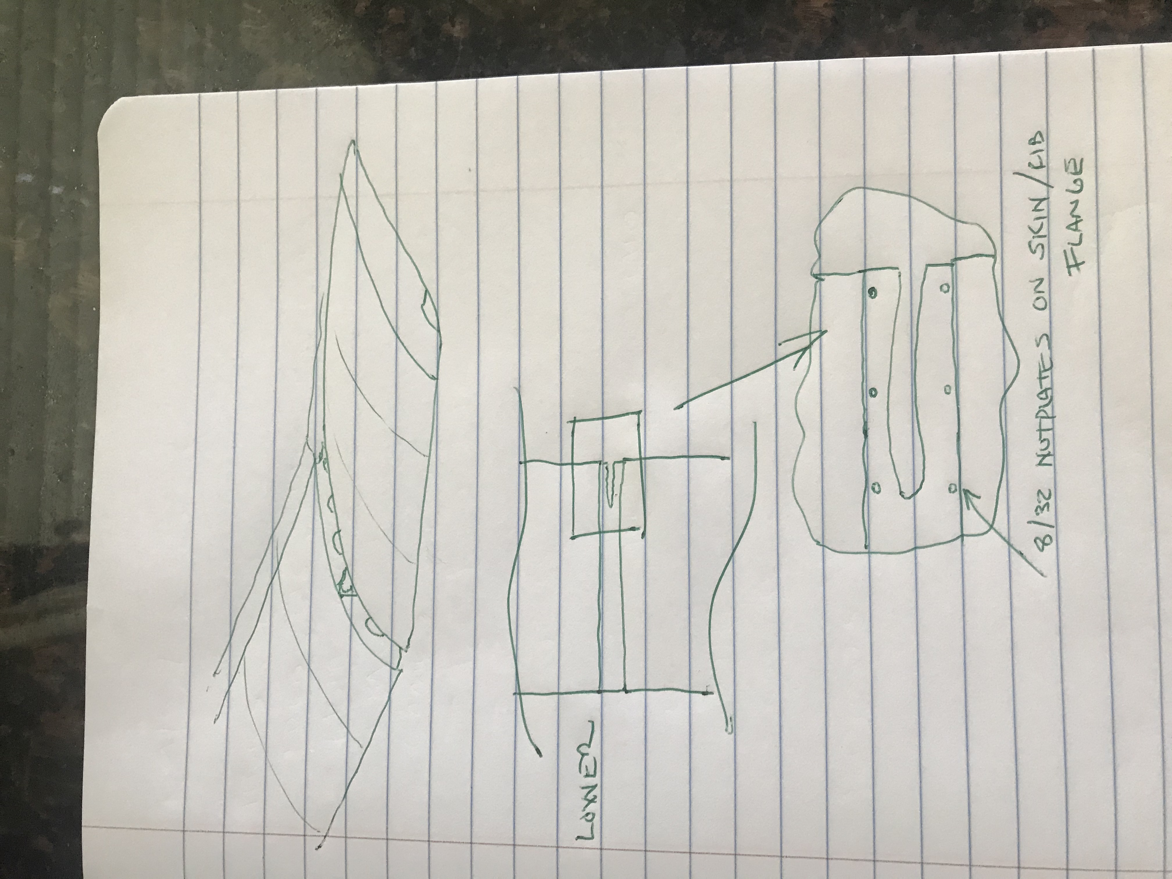 Lower attach, at the aft end attach the gap cover to the lower skin with <6> 8/32 nutplates they should line up with the area around the aileron control rod.